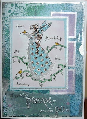 Here's a quick blogging of a card made for a Challenge at Papercraft Planet on Michelle Perkett's group. The image is Holly, the Christmas friendship fairy, from Michelle's Etsy shop. Jana provided a fun sketch to use and I chose wintry colours for my card. Both DPs are from Artylicious CDs, they are edged with a silver pen. The pen blotched all over the place when I was edging the large piece; I decided it was a great effect and left it alone :). The sentiment is from Elusive Images, silver embossed onto vellum. Fairy is coloured with Copics and has Flowersoft "fur" edging her robe. The background uses the palest shade of purple in Copic.