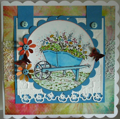 The wheelbarrow image is from Fred, She Said, and can also be bought as a coloured version.I've coloured with Copics and added some Glossy Accents to the flowers.  The DP is a gorgeous Prima sheet with large impressionist-style daisies on it.  The white background has been embossed with a Tim Holtz brick wall folder and the bottom punched with MS daisies.  The flowers and butterfly are punched and the tiny dotty buttons are Papermania.  I've added a wide piece of netting ribbony stuff, not sure what you'd call it:)