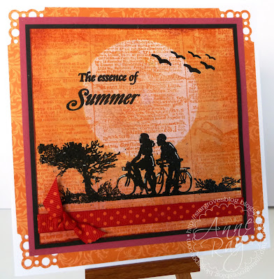 Here's my first card as part of the Design Team for the Creative Inspirations Challenge. The theme is Summer and I found just the right wording on some Inklicious stamps. I started out with a brayered background that I wasn't too happy with, so I overstamped it with my huge newspaper background stamp and then it looked fab! The silhouette is a Stamp Addicts stamp, birds are Inkylicious too. Background paper is Stampin' Up with a MS punch used on the corners.