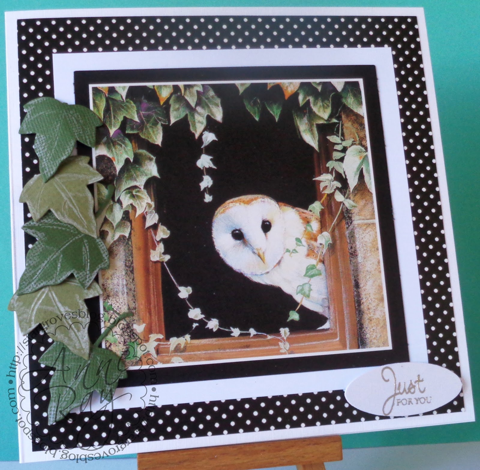 From time to time I get suckered in by craft programmes. The very talented Pollyanna Pickering has released her work on CD and also as a papercraft kit. There is often a deal if one buys both. However I tend not to use the papercraft and the pile of unloved stash grows. Trying to redress the balance here, I have added a some texture and interest with Joanna Sheen ivy leaf dies, shaded with white and green Inktense pencils. Image is matted and layered, polka dot paper and a Craftwork Cards sentiment added.