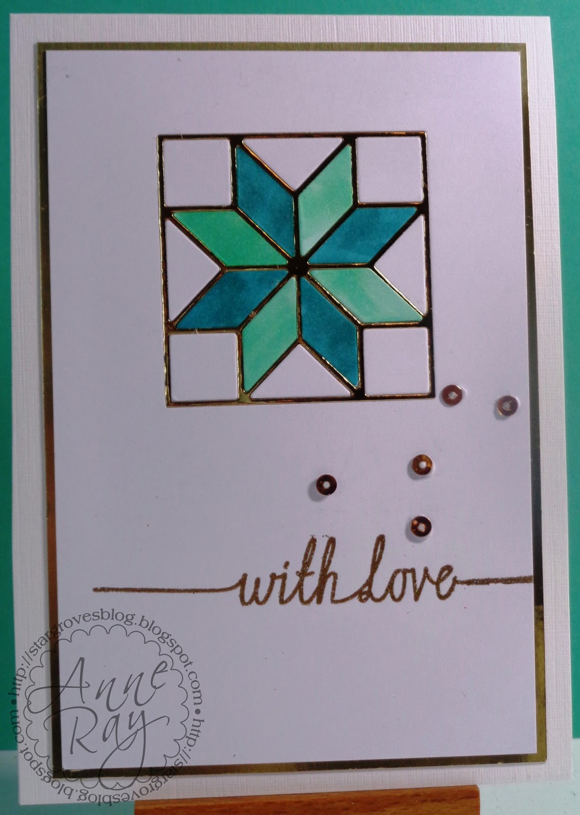 I'm sneaking in a second card that follows CAS Colours & Sketches layout. As a quilter I couldn't resist the WPlus9 dies, this card is for a quilting friend who is currently fighting cancer. I cut it from my white panel and again from gold. Coloured the star with Copics and assembled it all as an inlaid diecut. The embossed sentiment is Clarity. My card looked a little stark so I added a few tiny gold sequins. Usually they are a cover up for a smudge but this time the card needed them :).